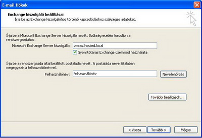 4. A "Microsoft Exchange Server kiszolgáló" mellé írja be: vmcas.hosted.local, a felhasználónév mellé írja be az e-mail címe "@" előtti részét. Az adatok megadása után a "További beállítások" gombra kell kattintani.